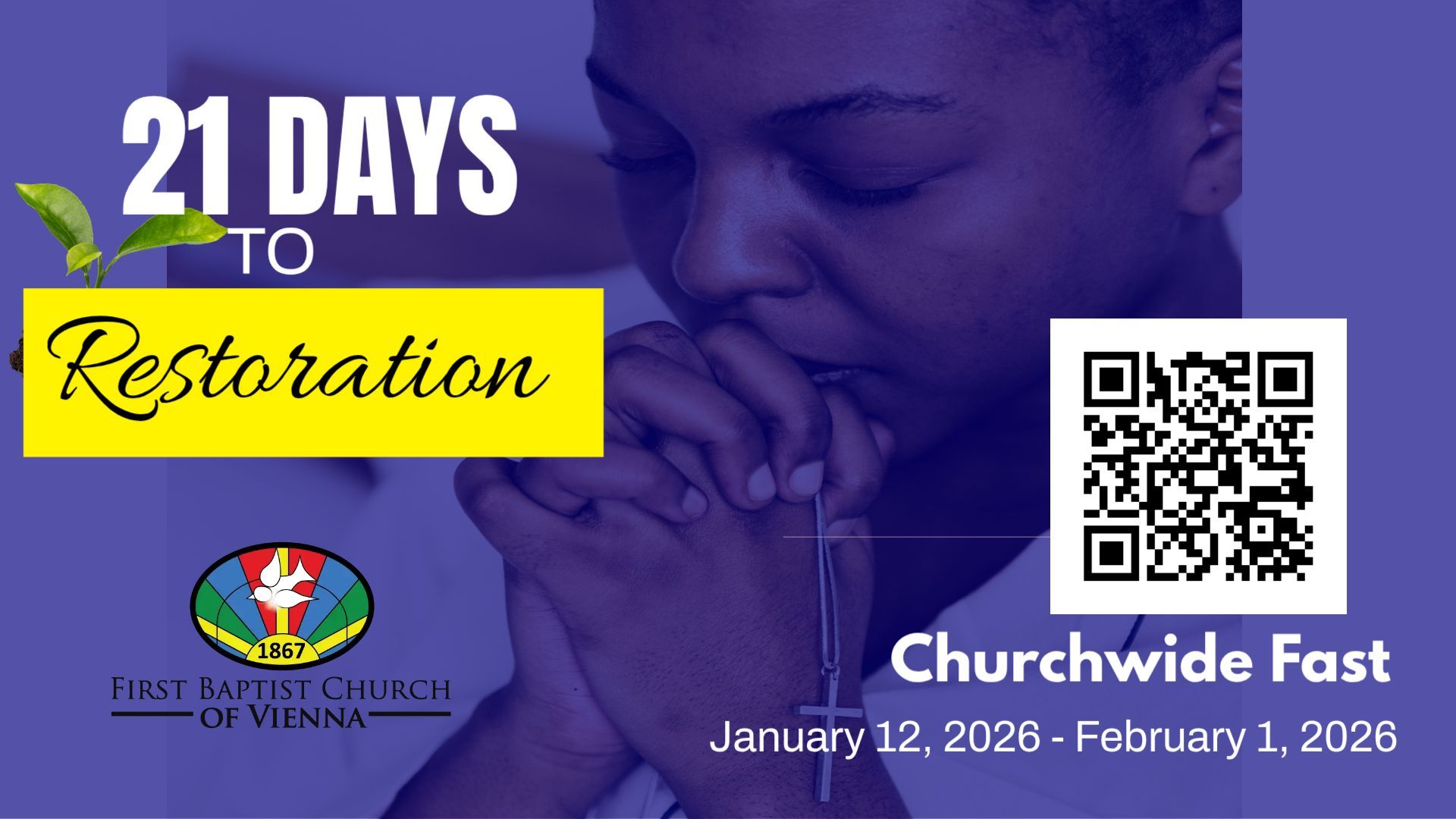 Join us on our churchwide Restoration Fast. Use the QR code to register and complete our commitment card. Follow along with our daily readings and activities by downloading the guide linked below. Print copies of our guide are available at the church.